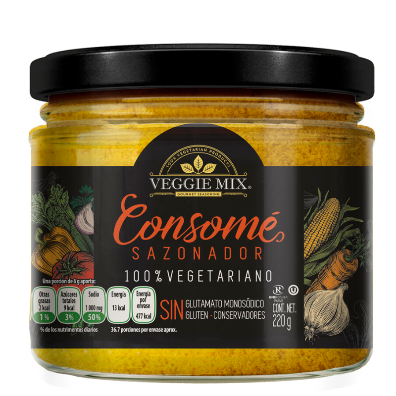 Tiendas Verum te recomienda el Sazonador Vegetariano VEGGIE MIX® el cual es un condimento ideal para ti dieta vegetariana ya que esta elaborado con ajo, cebolla, aceite cúrcuma, perejil, azúcar, fécula de papa, sal apio entero otros ingredientes que en conjunto dan un sabor genial para sazonar todas tus preparaciones.